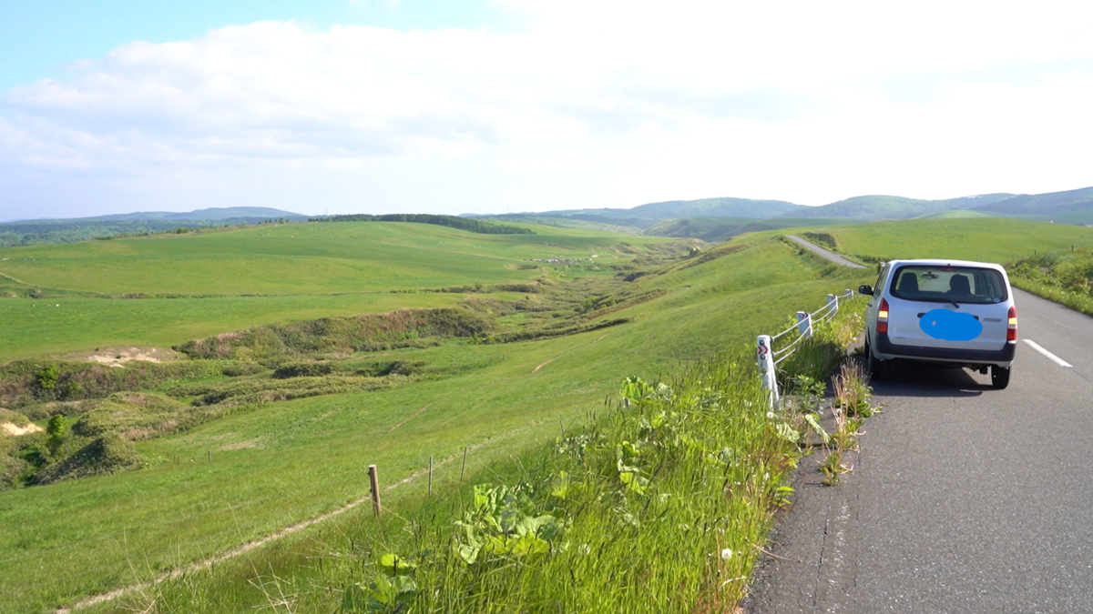 写真撮影の時間を含めると、かれこれ30分ぐらいおいたん①と話していたのだろうか。おいたん①と別れた後、また別の丘から牛たちを眺めていると、ふと、私の近くで車が停まった。